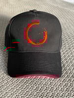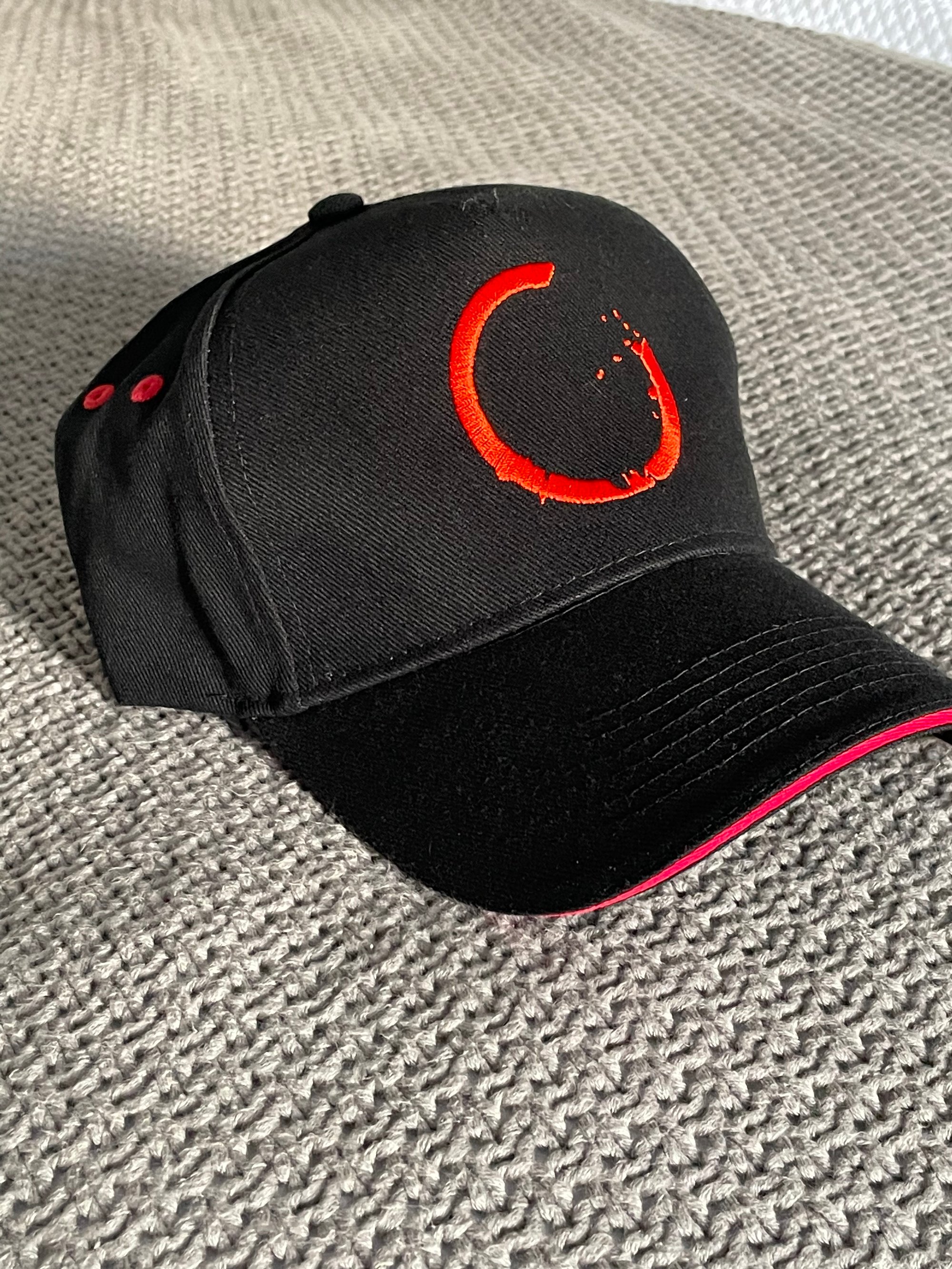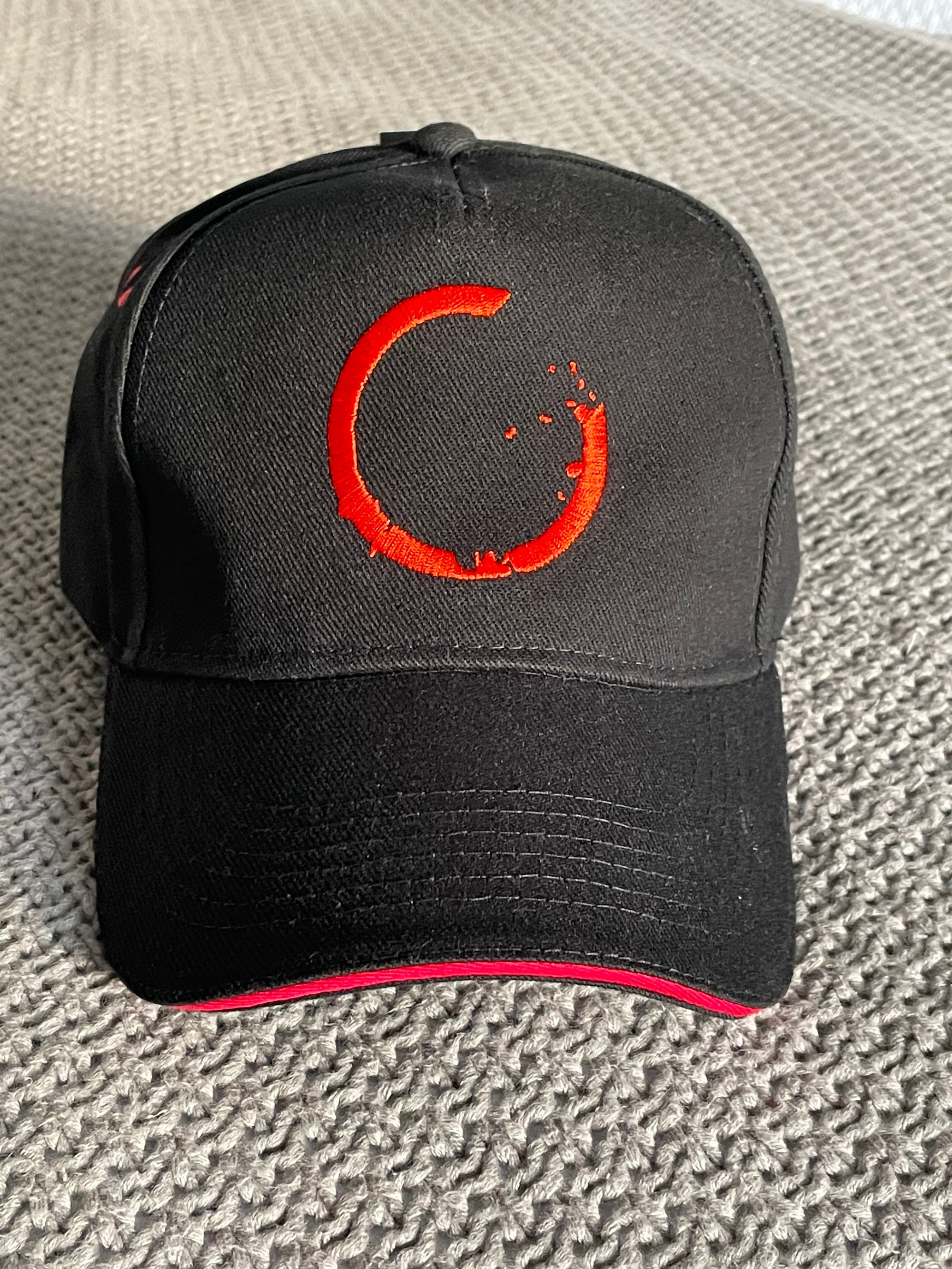 One size adjustable Black baseball cap with large embroidered Core C on front, red detailing and red sandwich brim.